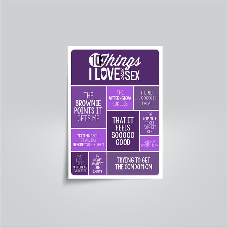 Part of the award-winning Trigife 10 Things I Love About... range, this porno poster details 10 of the things that are so wonderful about taking the bald headed gnome for a stroll in the misty forest. You'll be only too delighted to pop this on the wall in a prominent place and make sure all guests to your home know just how much you enjoy a bit of bow-chika-wow-wow. Choose from Playful Purple or Raunchy Red colour schemes, with white text. Classic moments are commemorated in phrases such as 'Trying to get the condom on' and 'The after-glow cuddles'.