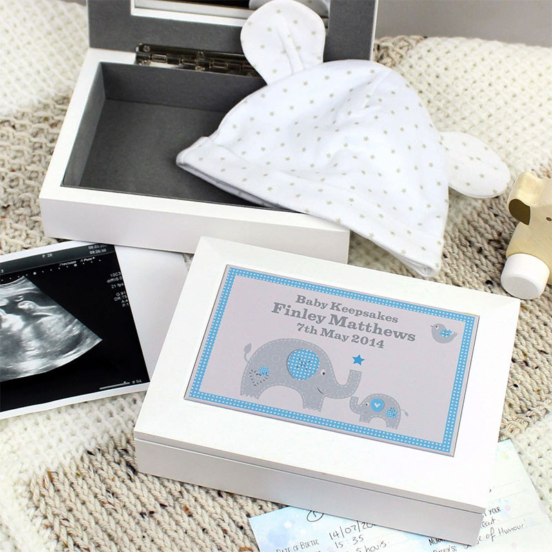 - 1 x Blue Baby Elephant White Wooden Keepsake Box