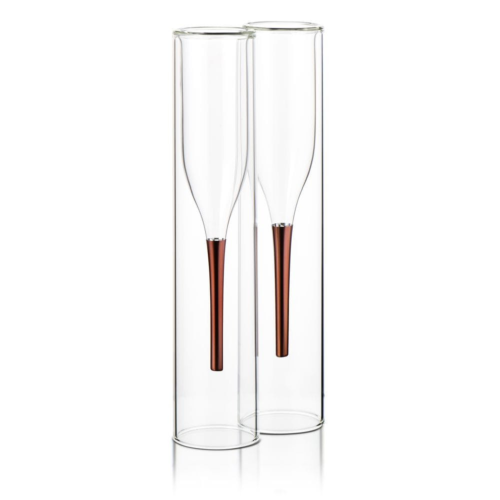 On the outside, these look a bit like a straight edged water glass - but when you pour your champagne into the top, it follows the usual lovely curves. It's basically a champagne glass suspended inside another glass and is bound to make people look twice when they see you drinking from it.