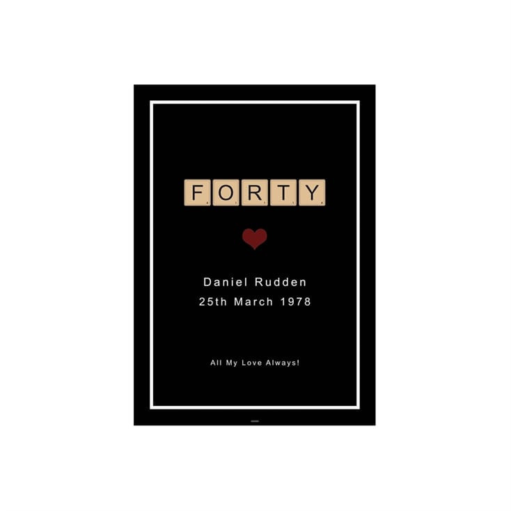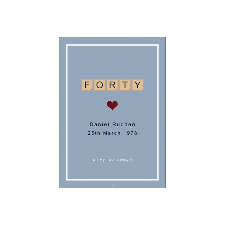 Inspired by word game style letter tiles, this poster spells out the word ‘FORTY’, leaving space for you to add your own name, date and message to your loved one. The ‘forty’ can refer to a birthday, or a ruby wedding anniversary – it’s up to you!