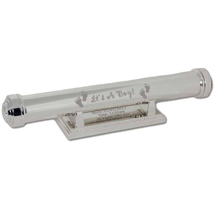 The Personalised Birth Certificate Holder with Stand makes a wonderful new baby present. It is available in two designs with either ‘It’s a Girl’ or ‘It’s a Boy’ as standard text. The stand can be engraved with a message, which can be spread out over 4 lines, up to 25 characters per line.