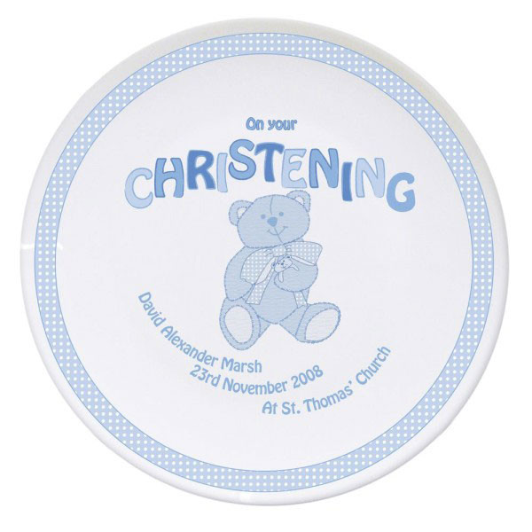 This Personalised Christening Plate makes an adorable keepsake for a boys christening. It’s lovingly printed with a blue teddy and the words ‘On your CHRISTENING’ as standard.