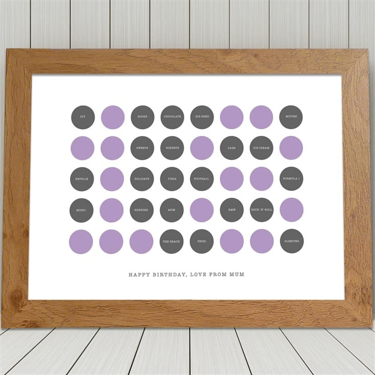 Not only is the number 18 the highlight here, but each of the surrounding circles contain a special word or phrase that relates to the recipient of the gift. You make the personalisation so you could list their personal qualities ('kind', 'funny', 'loving') or their hobbies ('cricket', 'dance', 'wine') or simply fill those circles with the names of family members ('Dave', 'Emily', 'Lola'). The choice really is up to you - you can probably come up with the perfect idea for them because you know them best.