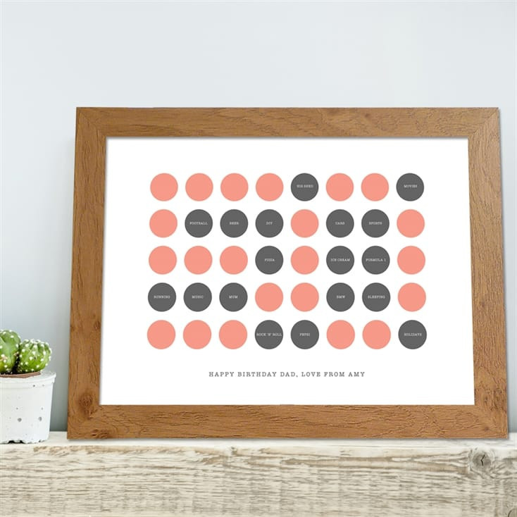 Looking a bit like a colour vision test, the number 50 appears in your choice of eight colours, and is surrounded by personalised circles containing a word or phrases about the birthday person.