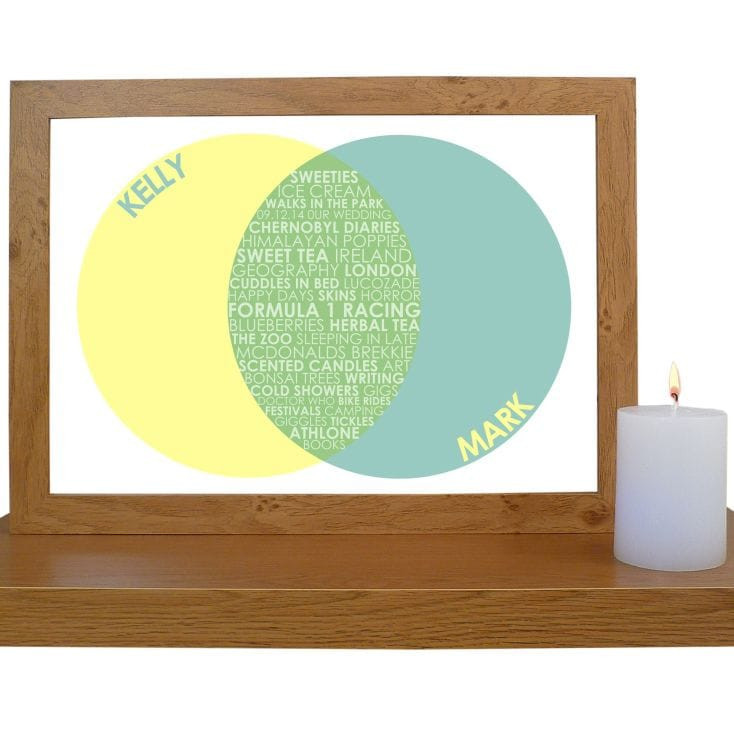 You can personalise the Venn Diagram with two names and up to 35 personalisations! This means that you can list everything the two people have in common, from favourite films, foods and drinks to a special song, places to visit, holiday memories, sayings and perhaps significant dates and maybe wishes for the future? Basically, where the two circles collide we will fill with whatever words you like. This makes this Personalised Venn Diagram Print a wonderfully unique gift for an Anniversaries, Weddings, Birthdays and Valentine’s Day too!