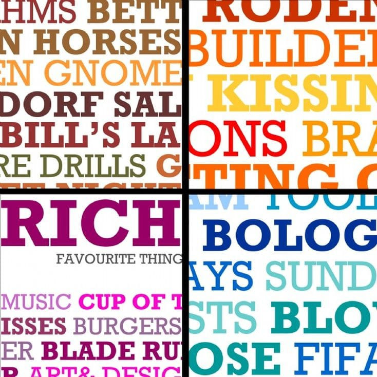 Choose your desired colour scheme (Autumn/Blush/Sea/Lavender and Citrus) and list up to 15 favourite things that define your friend or family member, and we do the rest! Your final picture will have the text arranged in a flowing pattern, from line to line, splitting some words. This is intentional and creates a contemporary typographic effect.
