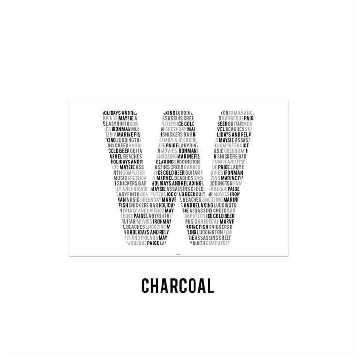We've brought a new design to our ever popular line of personalised prints- now you can have all your favourite things arranged nice and snugly into the shape of your initial! Simply tell us which letter you'd like to feature, give us a list of up to 15 things you or your recipient loves, and we'll do the rest. You can pick just about anything- favourite foods, TV shows, fictional characters, sports teams, hobbies, favourite band or even the name of a beloved pet. Be as creative as you like! Our in-house graphic design team will transform it into a special one-of-a-kind print just for you.