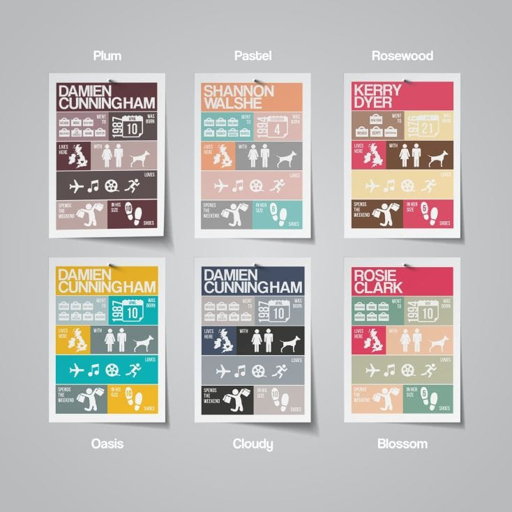 Name, location, family, pets, hobbies and interests... get the lowdown all in one infographic, uniquely designed for you by our team of in-house graphic designers. All you have to do is fill in the personalisation fields, tell us which of our 6 attractive colour schemes you like the most, and we'll do the rest!