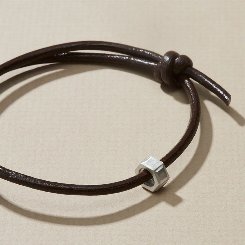 There's nothing more thoughtful than personalised jewellery, and this is a very special piece that's a bit different from the rest. A sturdy black leather cord is looped stylishly around a large flat brushed silver nut and attaches it to your wrist. Nuts are something that we associate with forming connections, keeping things together and strengthening bonds, so what could be a more appropriate symbol for someone that you care about? Not only that but the nut bracelet can be personalised with your choice of message, which appears etched into the flat face of the nut. You can choose any (nice!) message you like and have a maximum of 25 characters to spell it out with. When we come to make your unique piece of jewellery, our designers will split up the message to best fit around the surface of the nut (as shown).