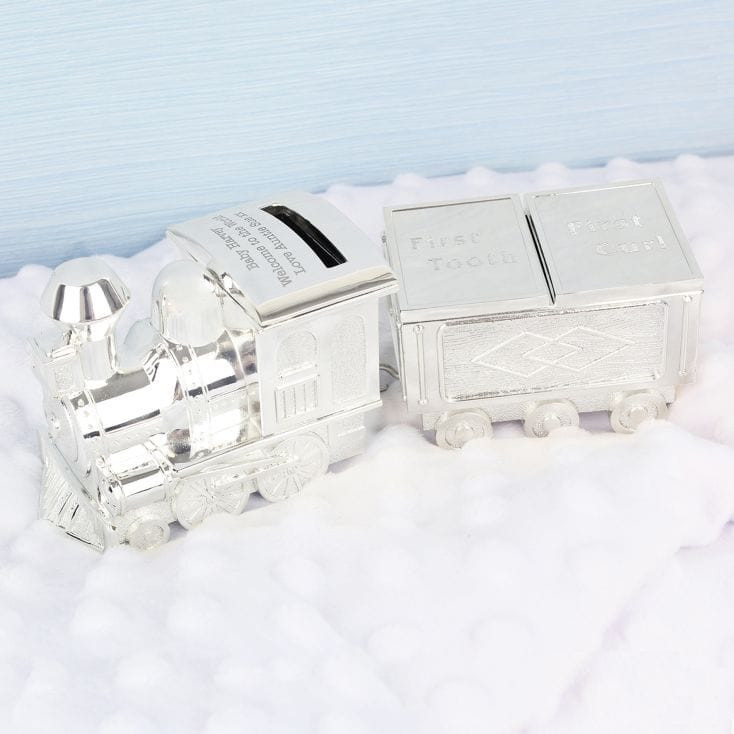 New parents are sure to love this silver train money box. Money banks are a traditional gift for a Christening but this one adds a wonderful twist with the addition of a carriage that will hold baby's first tooth and curl. Designed specifically with new-borns and their parents in mind, this beautifu