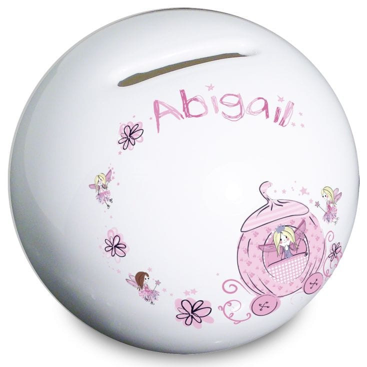 Fairy money boxes are a wonderful fairy-tale gift for young children. The delicate design features a fairy in a pumpkin carriage, with a trail of flowers and fairies leading to your recipients name above. Such a dainty motif will encourage any little girl to save her pennies in this gorgeous money bank. The ultimate magical gift, this Fairy Money Box will aid any fairy princess in her quest to save for her first set of wings.