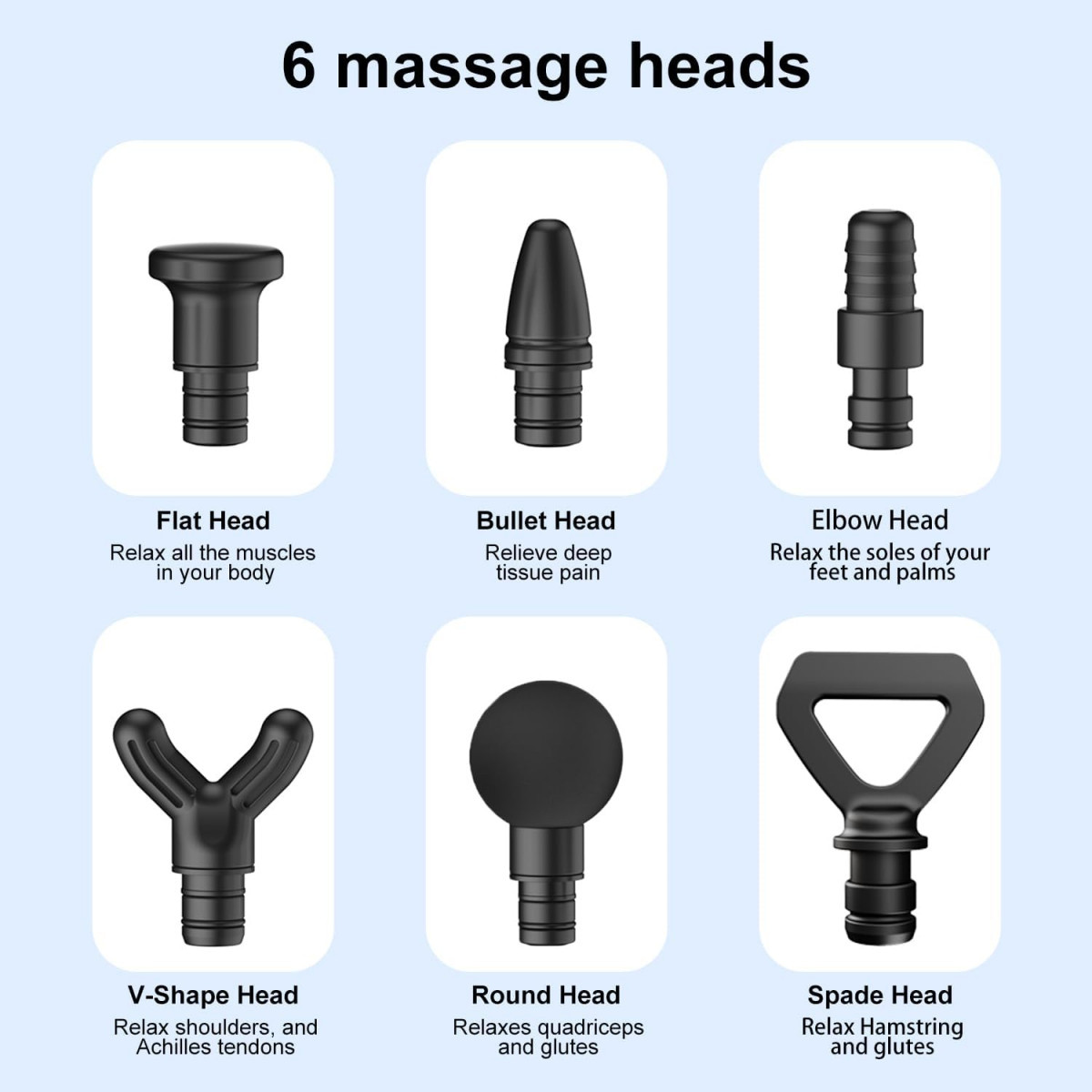 - Interchangeable heads — customize your massage to suit different muscle groups.